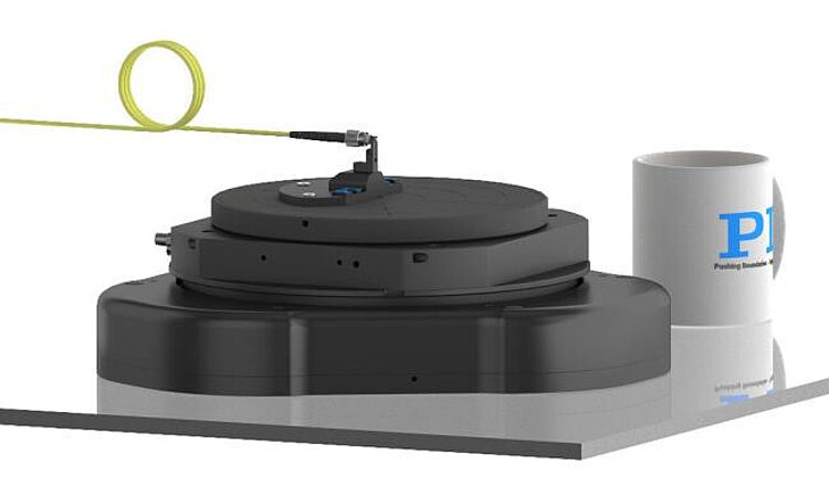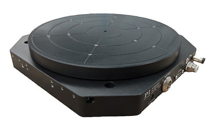 PIglide air-bearing XY rotation stage; voice coil drive; ±2.5 mm × ±2.5 mm travel range (X × Y), ±1° rotation range (θZ); 30 N load capacity; 3 incremental encoders with sin/cos signal transmission, 80 µm signal period