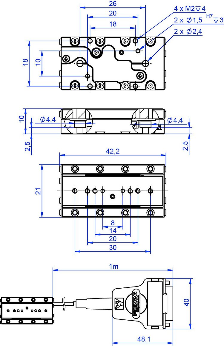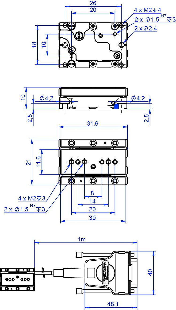 Q-Motion® miniature linear stage, piezoelectric inertia drive, 32 mm travel range, linear encoder, 1 nm resolution, 0.6 N drive force, dimensions 21 × 42 × 10 mm (W × L × H)