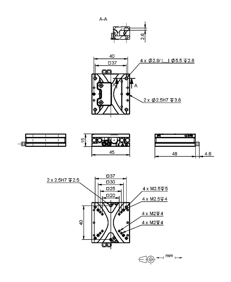 Q-Motion® linear stage, piezoelectric inertia drive, 26 mm travel range, linear encoder, 1 nm resolution, 7 N drive force, dimensions 45 × 63 × 15 mm (W × L × H)