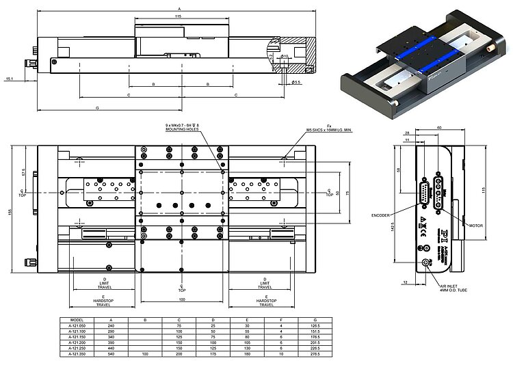 A-121 PIglide AT1 Series Linear Air Bearing Stage, Linear Motor Driven with Encoder Feedback