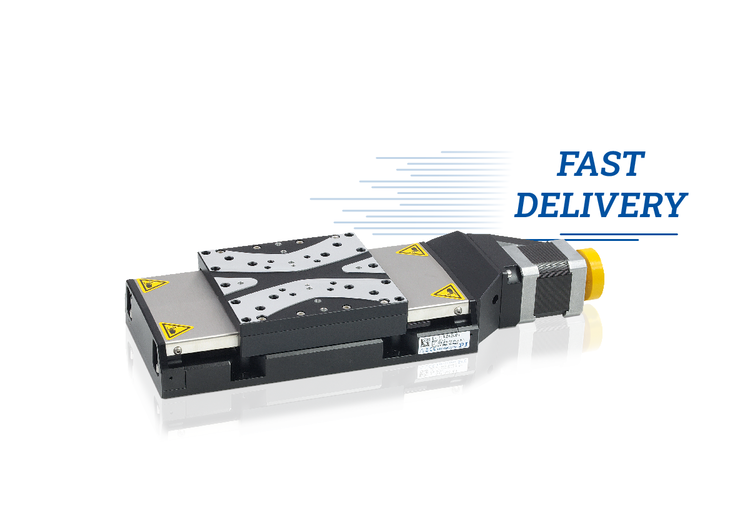 High-precision linear stage; DC motor; 102 mm travel range; 500 N load capacity; 90 mm/s maximum velocity; ball screw; incremental rotary encoder, 20000 counts/rev sensor resolution, A/B quadrature, RS-422