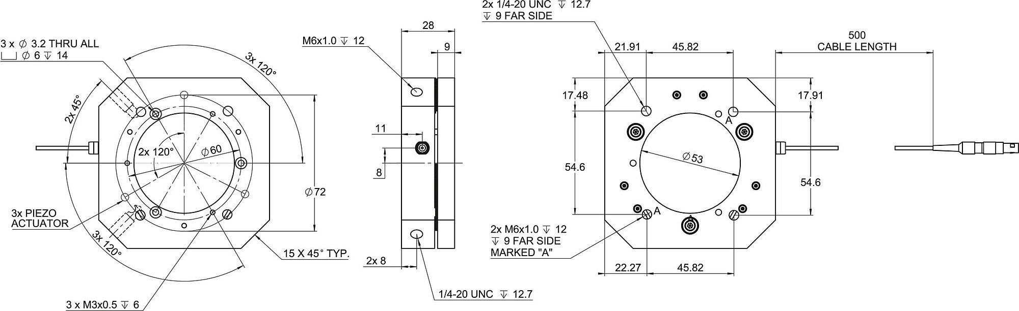 Note on electrical capacitance: 1,5 µF per piezo actuator. Small-signal capacitance measured at 1 Vpp, 1 kHz, room temperature, tolerance ±20 %