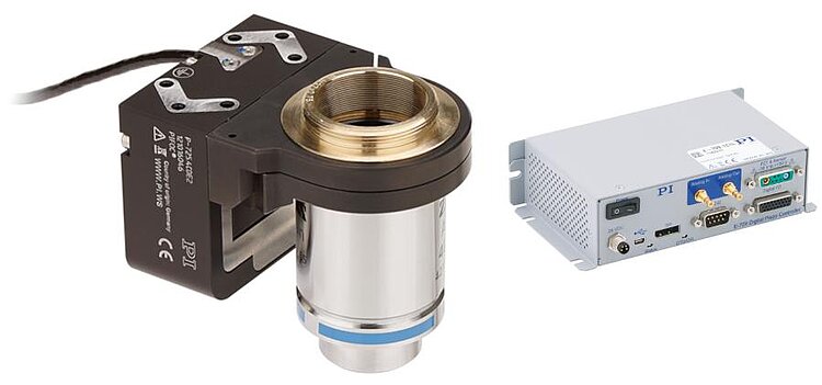PIFOC scanner system for microscope objectives; fast step-and-settle; 100 µm travel range; capacitive, direct position measuring; D-sub 7W2 (m) connector; 1.5 m cable length. System consisting of P-725.1CDE1 PIFOC scanner and E-709.1C1L controller.