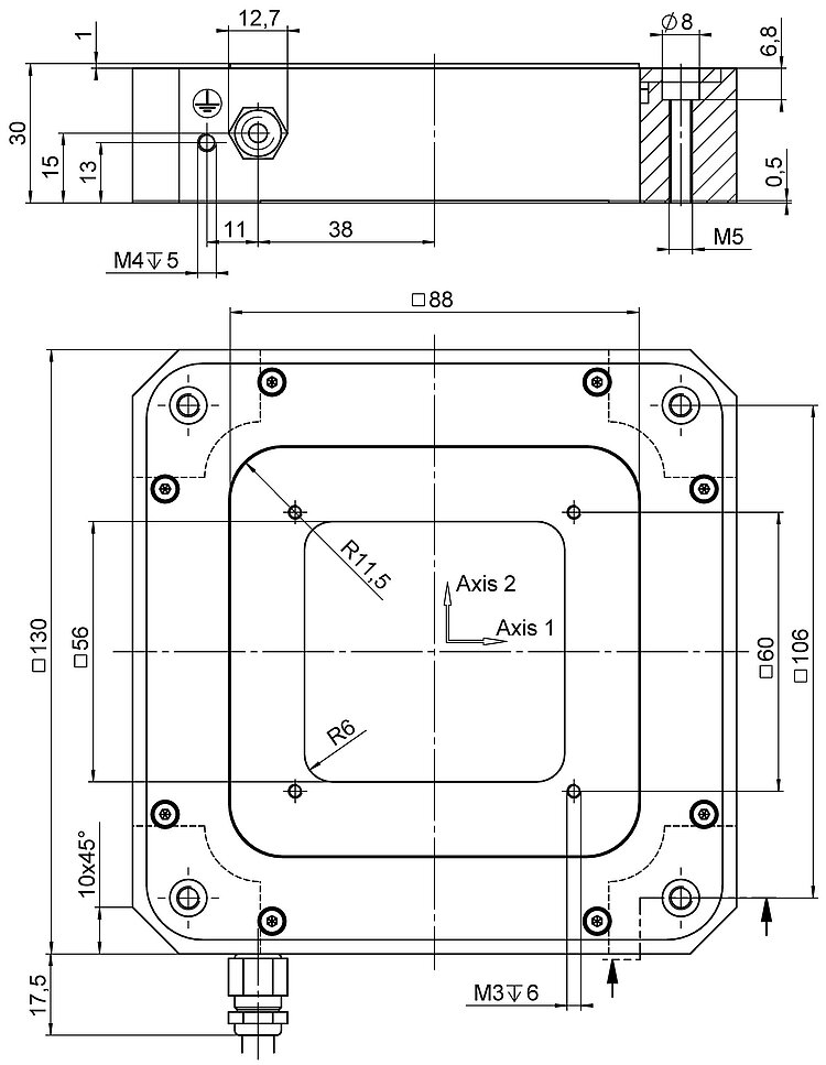 XY piezo scanner; 100 µm × 100 µm travel range (X × Y); capacitive, direct position measuring; D-sub 25W3 (m); 1.5 m cable length