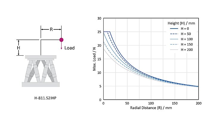 The PIVirtualMove software, which can be downloaded free of charge, simulates the travel range, the alignment, and the permissible forces and torques of the H-811 to facilitate an optimum system configuration. In this context, both the chosen center of rotation and the center of gravity of the load are taken into consideration.