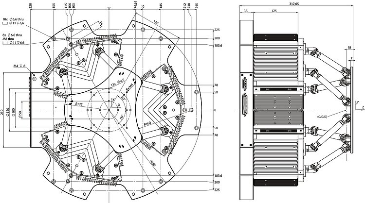 The friction-free drive design is based on voice coil drives and flexure guides. The struts and platform are made of carbon fiber for minimal moved mass and inertia.