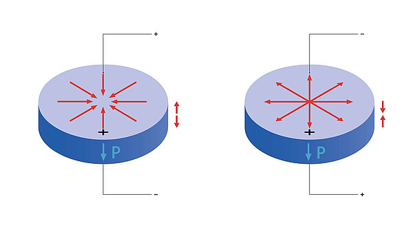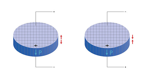 액추에이터로 사용될 경우, 전압이 인가되면 피에조 디스크는 기계적 변위를 발생시킵니다. 이 변위는 직류에서는 정적 변형의 형태로, 교류에서는 초음파 범위와 같은 진동 형태로 나타날 수 있습니다. 피에조 컴포넌트의 설계에 따라, 이러한 운동은 종방향 또는 반경 방향으로 발생할 수 있습니다. 편향 진폭은 피에조 디스크의 크기와 인가된 전압에 의해 결정됩니다.
