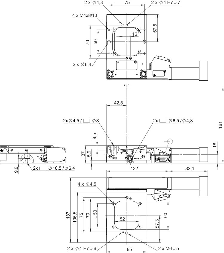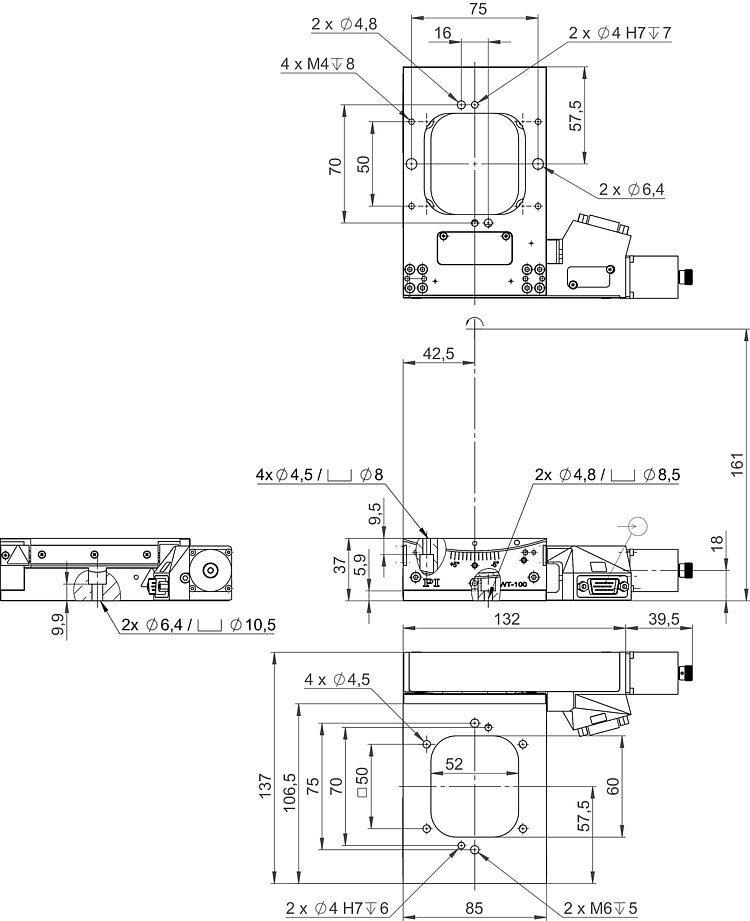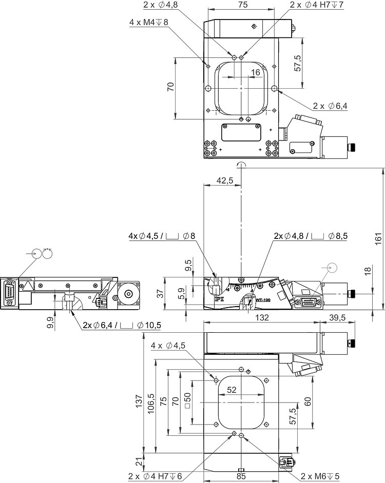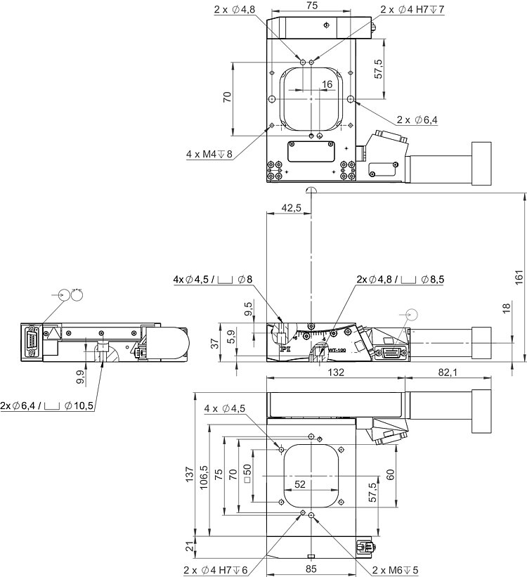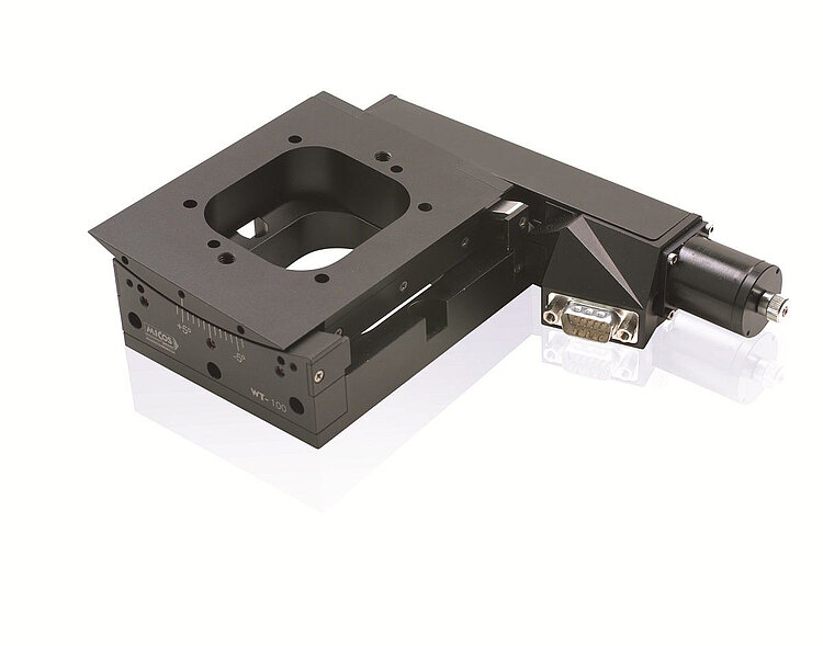 Drive with high gear ratio for precision positioning. Two limit switches. Large clear aperture with 60 mm × 25 mm.