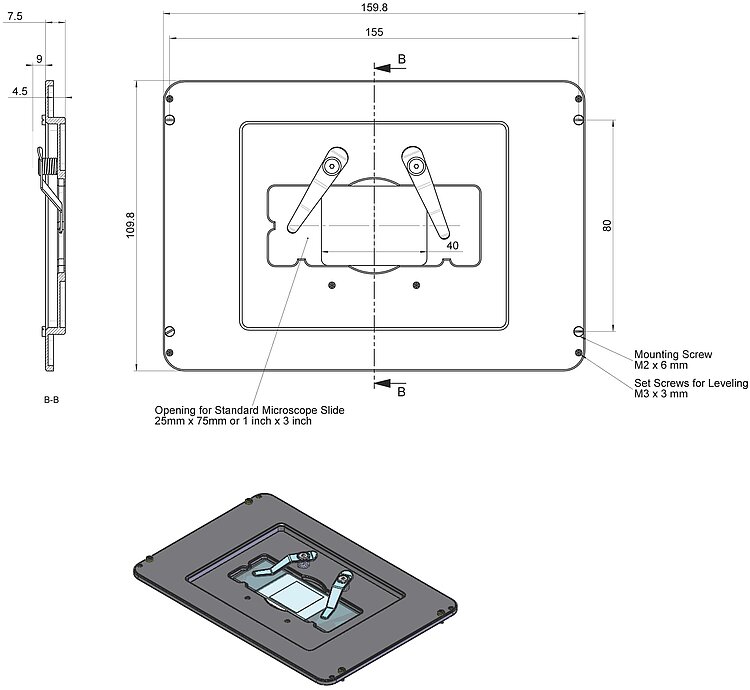 Microscope slide holder, for P-736.ZCN2S / P-736.ZRN2S PInano® Z piezo scanner systems (compatible with U-780.DNS systems for Nikon microscopes)