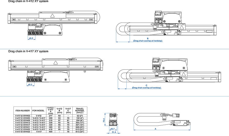Regardless of the travel range of the Y axis, the V-417.E1XYH drag chain must be selected for the travel range of the X axis.