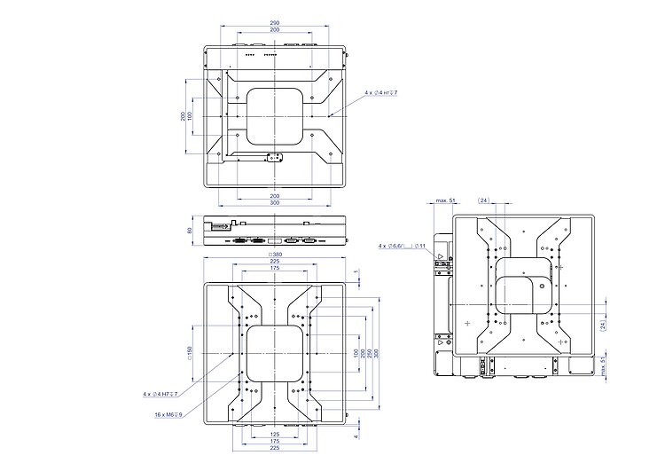 High-precision XY stage, ironless 3-phase linear motor; 102 mm x 102 mm travel range (X × Y); 100 N load capacity; 500 mm/s × 500 mm/s maximum velocity; incremental linear encoder, 20 µm sensor signal period, sin/cos, 1 V peak-peak